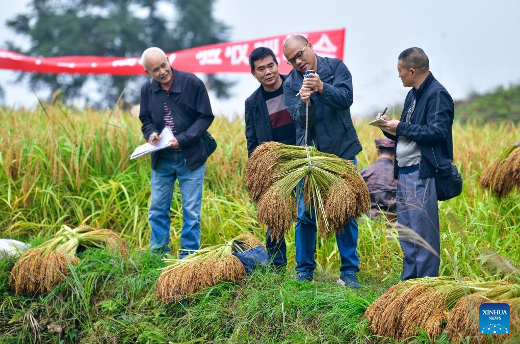 Agricultural technicians conducts a yield measurement of glutinous rice in Jianhua Village of Congjiang County of Qiandongnan Miao and Dong Autonomous Prefecture, southwest China's Guizhou Province, Oct. 11, 2023. (Xinhua/Yang Wenbin)