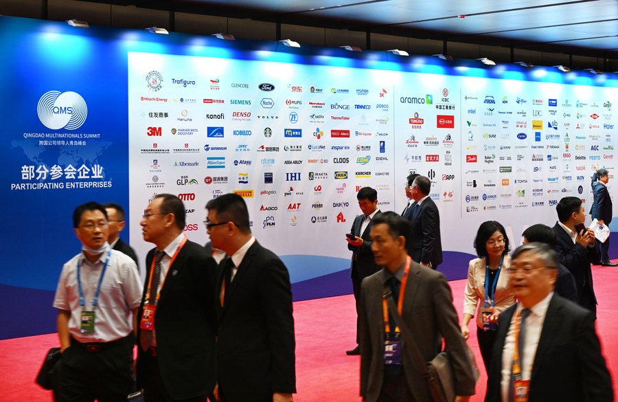 Participants walk past a bulletin board displaying names of participating enterprises during the fourth Qingdao Multinationals Summit in Qingdao, east China's Shandong Province, Oct. 11, 2023. (Xinhua/Li Ziheng)