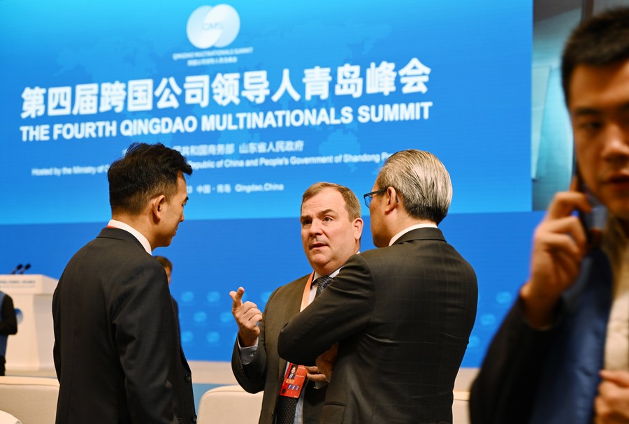Participants talk during the fourth Qingdao Multinationals Summit in Qingdao, east China's Shandong Province, Oct. 11, 2023. (Xinhua/Li Ziheng)