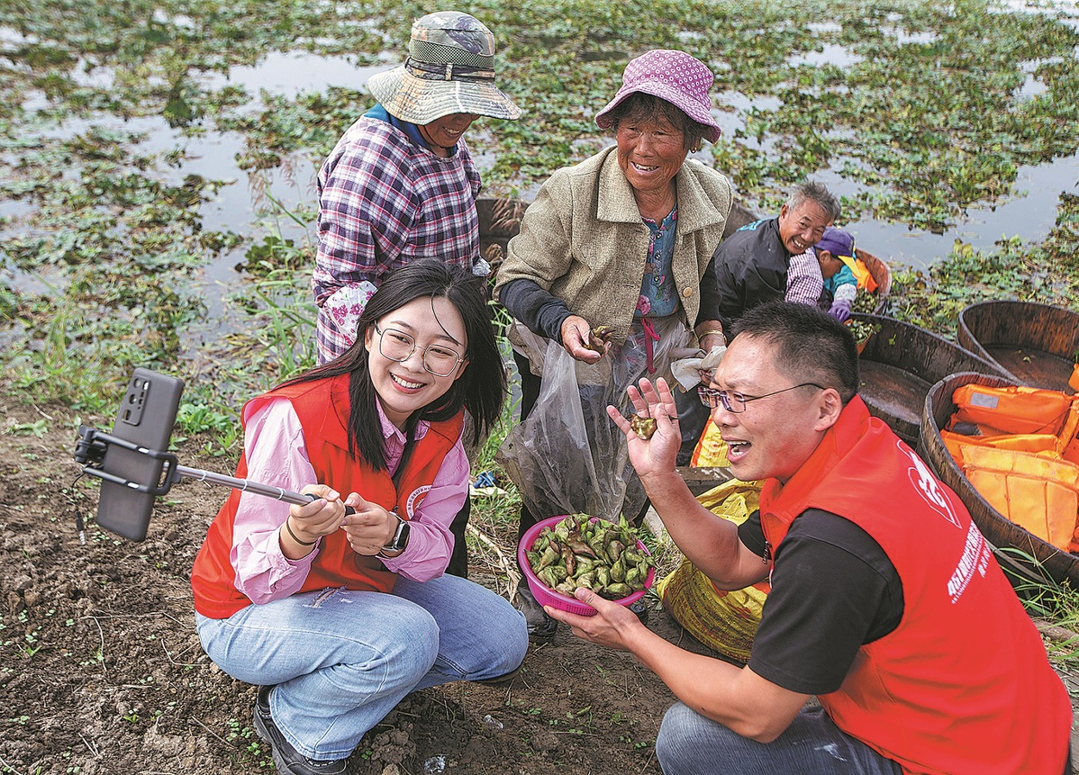 Grassroots officials sell fresh water chestnuts via livestream next to a pond in Hai'an, Jiangsu province, on Oct 9, 2023. The young officials have been encouraged to help farmers expand their sales channels through livestreaming. [Photo by Zhai Huiyong/For chinadaily.com.cn]