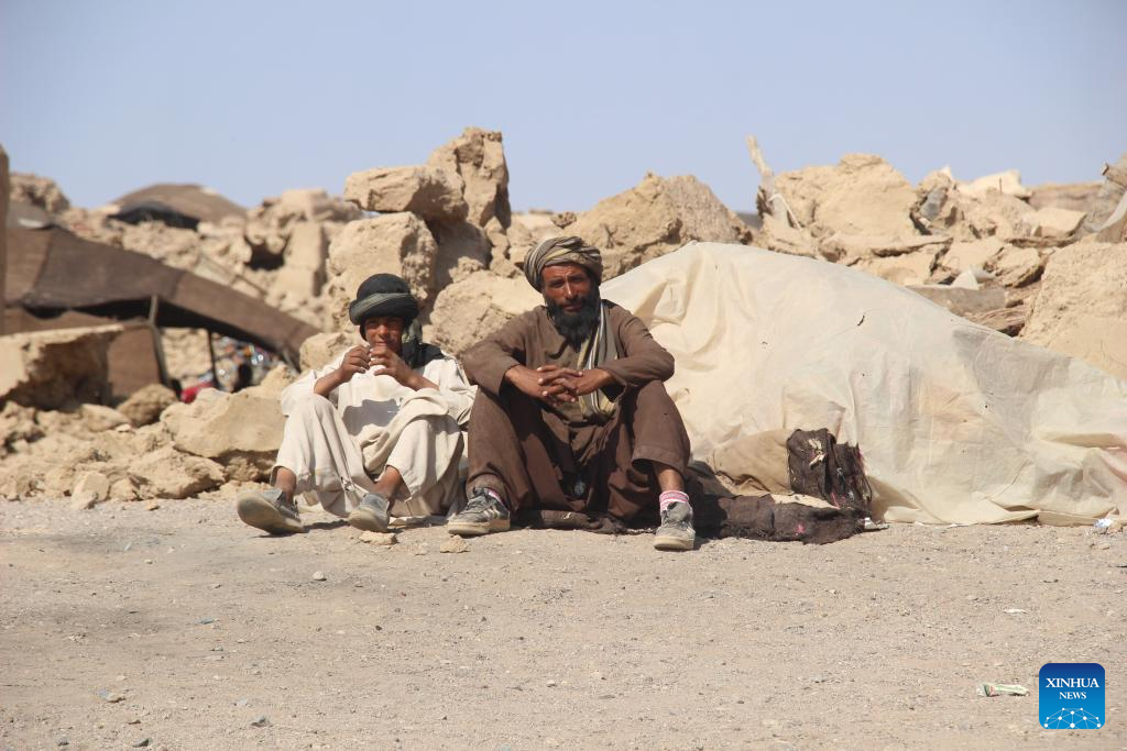 Two men sit in front of ruined houses after earthquakes in Herat Province, Afghanistan, Oct. 11, 2023. Two earthquakes each with a magnitude of 6.2 on the Richter scale, followed by several aftershocks, rocked west Afghanistan with an epicenter in the Zanda Jan district of Herat province on Saturday, leaving at least 2,053 dead and thousands more injured. (Photo by Mashal/Xinhua)