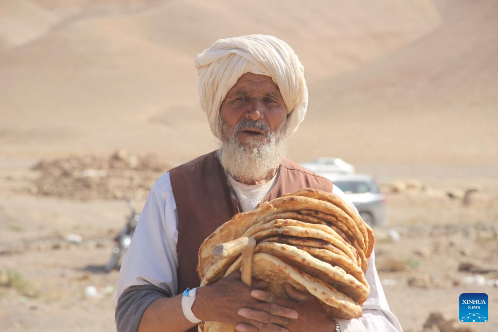 An old man holds pieces of naan, a kind of traditional bread, following earthquakes in Herat Province, Afghanistan, Oct. 11, 2023. Two earthquakes each with a magnitude of 6.2 on the Richter scale, followed by several aftershocks, rocked west Afghanistan with an epicenter in the Zanda Jan district of Herat province on Saturday, leaving at least 2,053 dead and thousands more injured. (Photo by Mashal/Xinhua)
