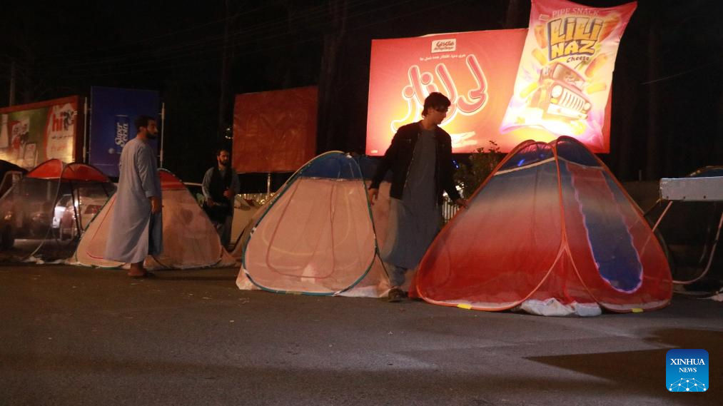 Residents set up tents in an open area for fear of possible aftershocks following earthquakes in Herat City, west Afghanistan's Herat Province, Oct. 12, 2023. Two earthquakes each with a magnitude of 6.2 on the Richter scale, followed by several aftershocks, rocked west Afghanistan with an epicenter in the Zanda Jan district of Herat province on Saturday, leaving at least 2,053 dead and thousands more injured. (Photo by Mashal/Xinhua)