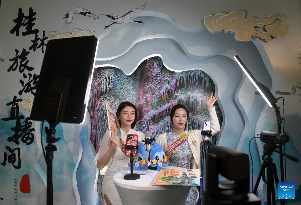Two live-streamers promote tourism products at the 2023 China-ASEAN Expo Tourism Exhibition in Guilin, south China's Guangxi Zhuang Autonomous Region, Oct. 13, 2023. (Xinhua/Lu Boan)