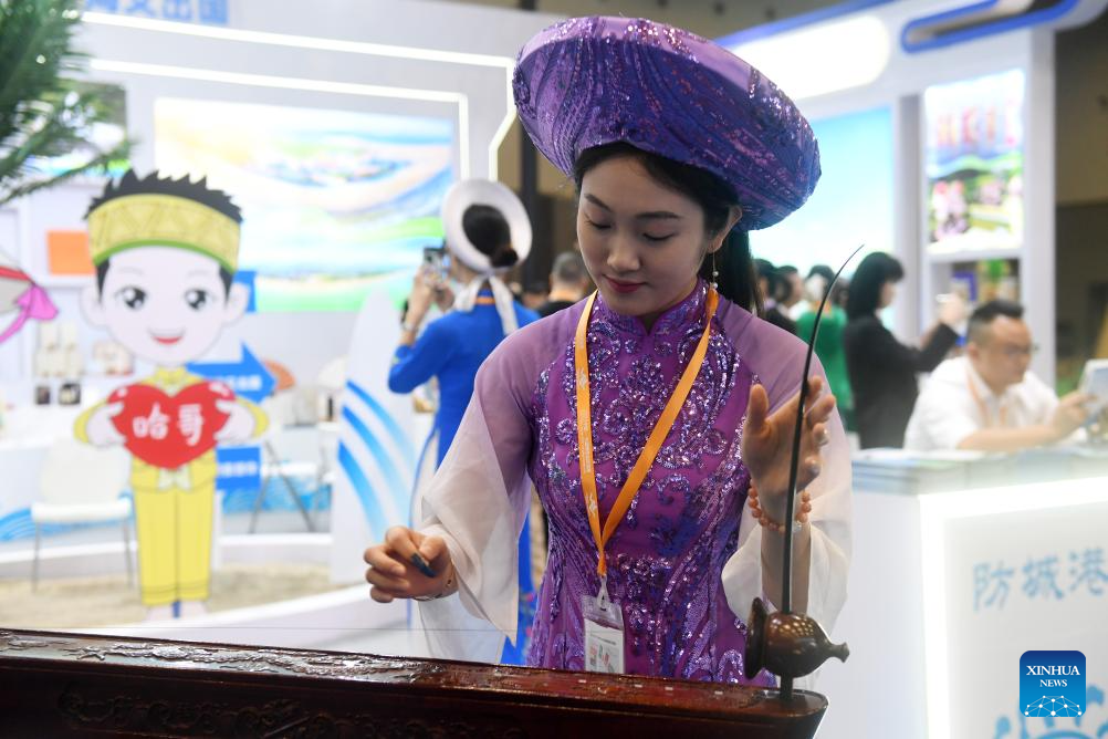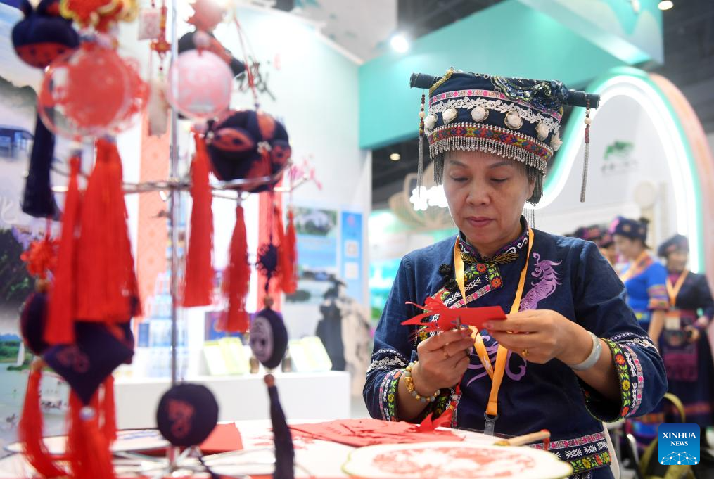 An intangible cultural heritage inheritor shows paper-cutting art at the 2023 China-ASEAN Expo Tourism Exhibition in Guilin, south China's Guangxi Zhuang Autonomous Region, Oct. 13, 2023. (Xinhua/Lu Boan)