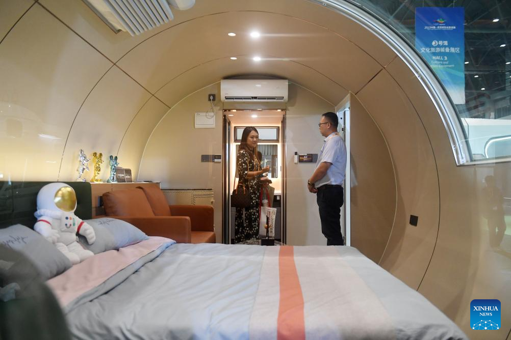 People visit the cultural tourism equipment exhibition area of the 2023 China-ASEAN Expo Tourism Exhibition in Guilin, south China's Guangxi Zhuang Autonomous Region, Oct. 13, 2023. (Xinhua/Lu Boan)