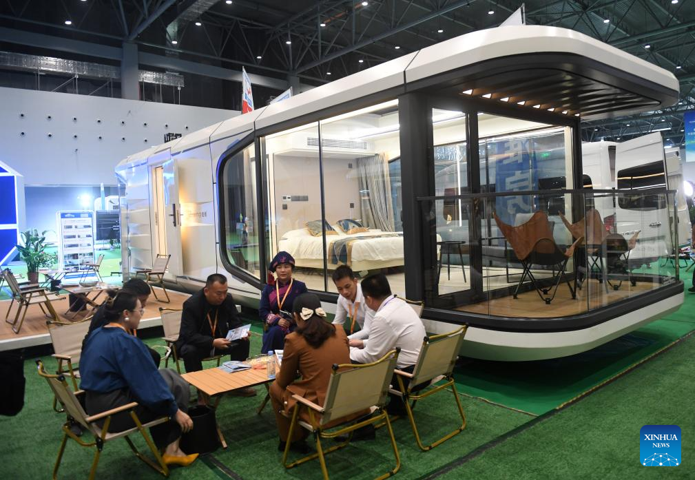 People talk at the cultural tourism equipment exhibition area of the 2023 China-ASEAN Expo Tourism Exhibition in Guilin, south China's Guangxi Zhuang Autonomous Region, Oct. 13, 2023. (Xinhua/Lu Boan)