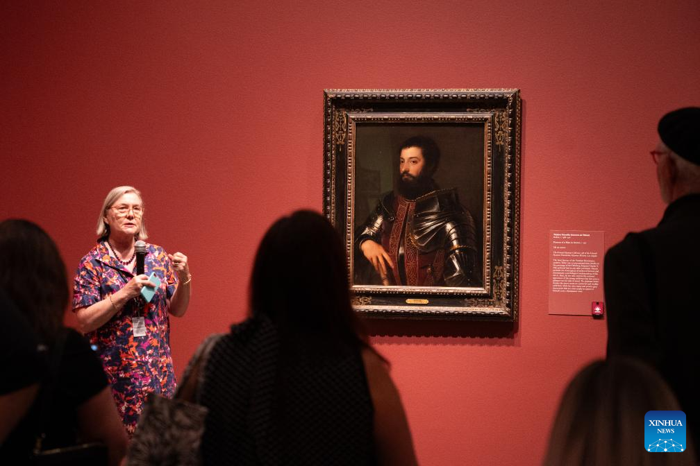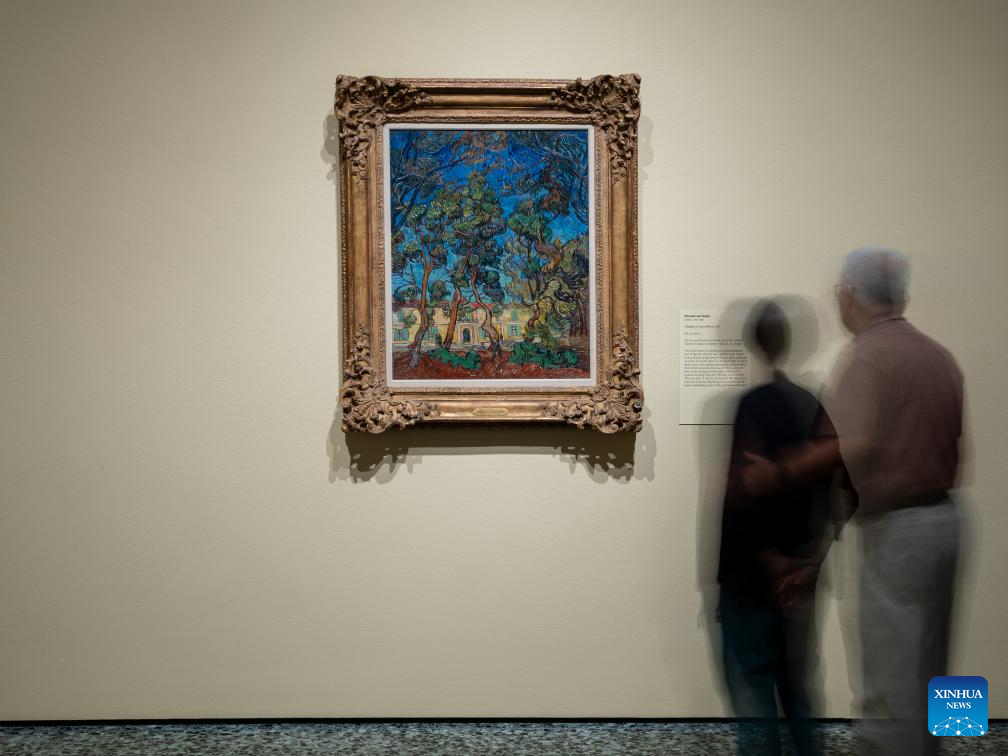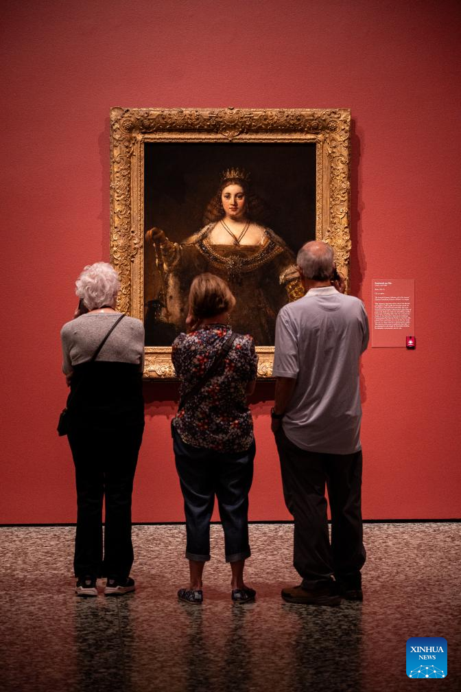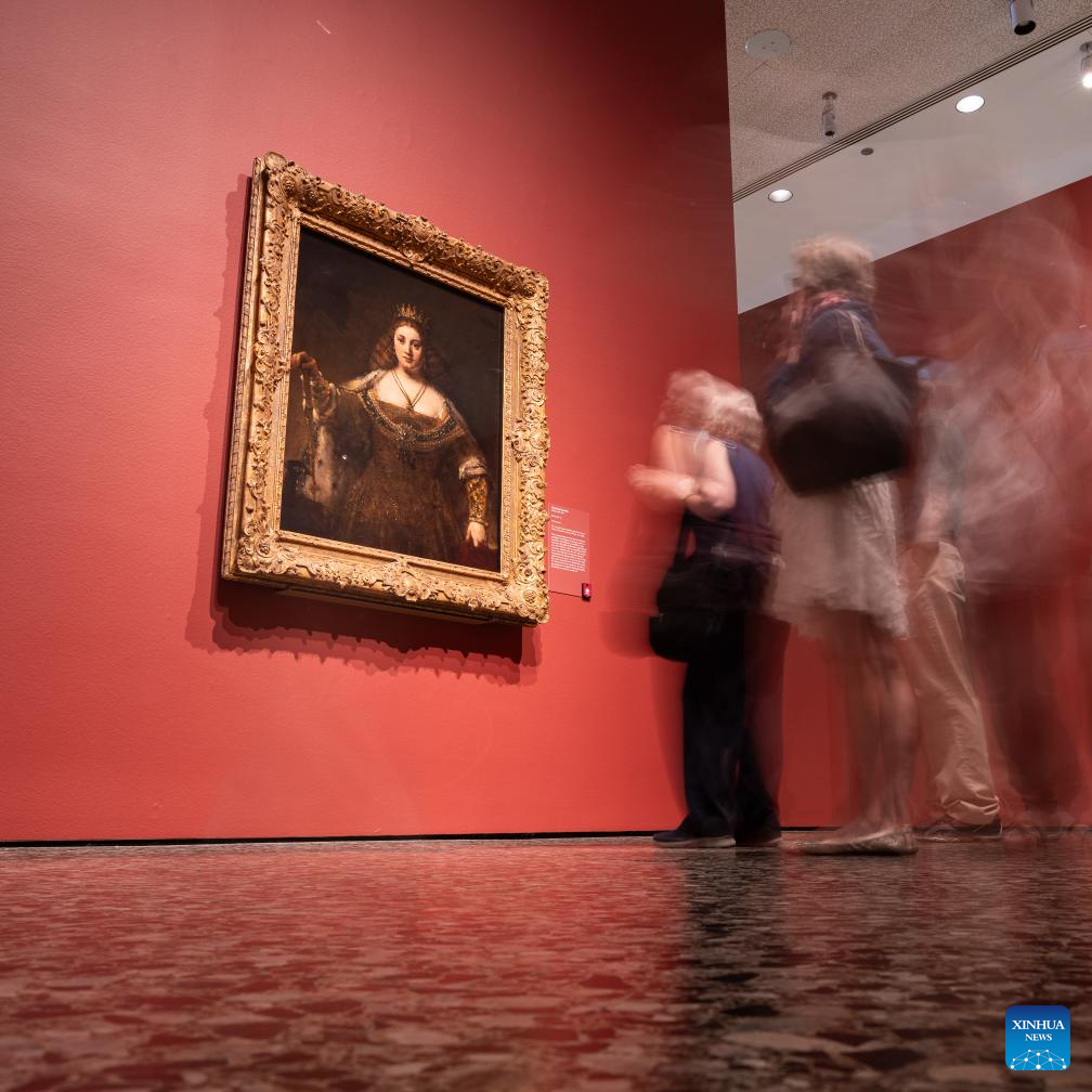 People view an artwork at the preview of an exhibition titled From Rembrandt to Van Gogh: Masterpieces from the Armand Hammer Collection at the Museum of Fine Arts, Houston, Texas, the United States, on Oct. 13, 2023. The exhibition will run from Oct. 15, 2023 to Jan. 21, 2024. (Photo by Chen Chen/Xinhua)