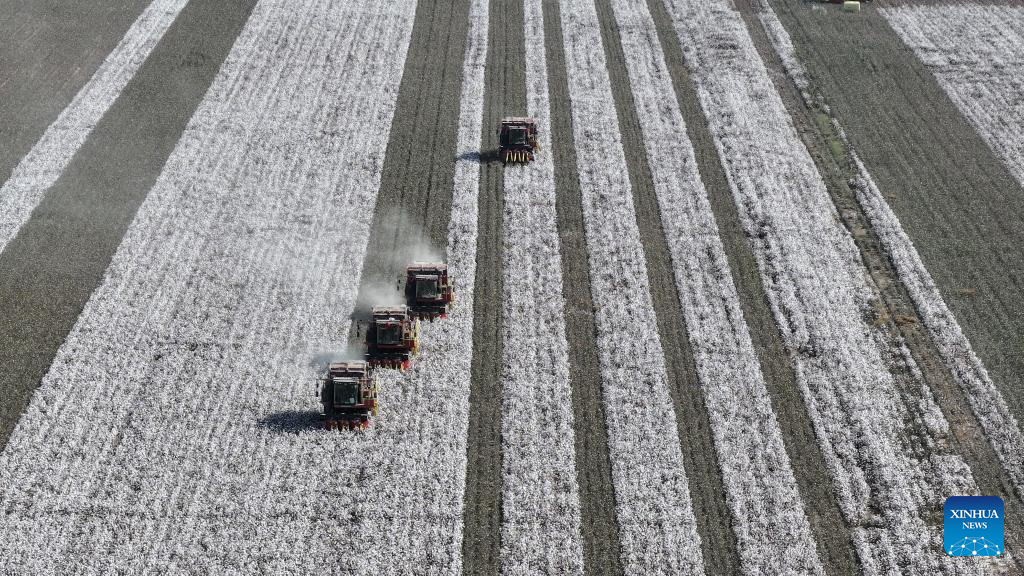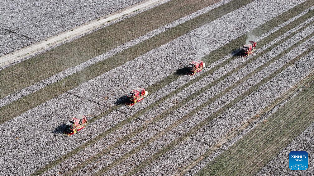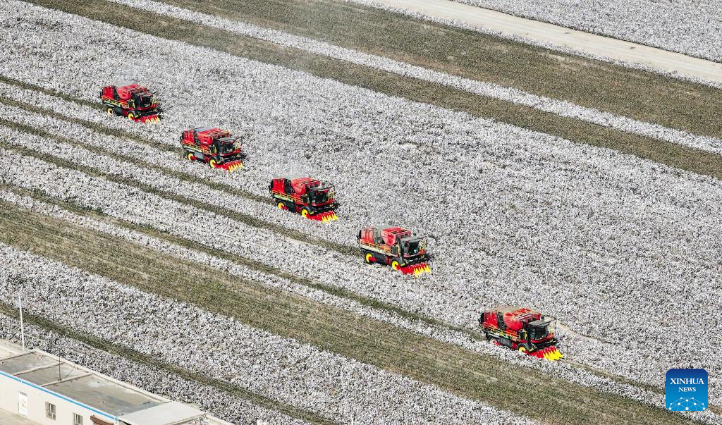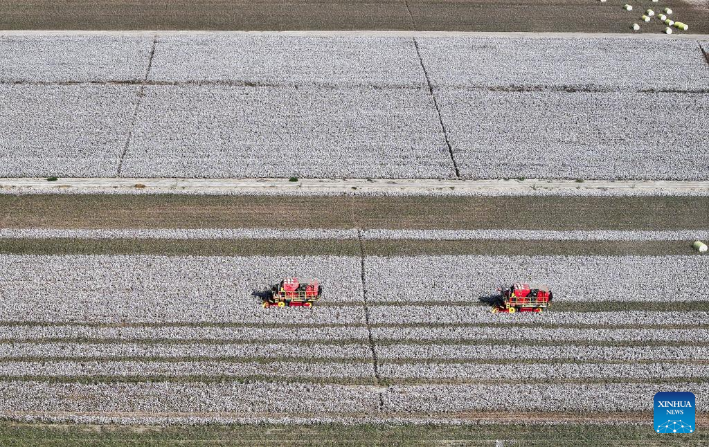 This aerial photo taken on Oct. 12, 2023 shows farmers harvesting cotton in Korla, northwest China's Xinjiang Uygur Autonomous Region. (Xinhua/Li Xiang)