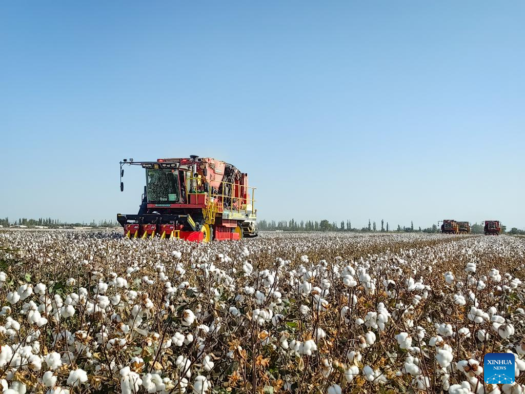 This photo taken on Oct. 12, 2023 shows farmers harvesting cotton in Korla, northwest China's Xinjiang Uygur Autonomous Region. (Xinhua/Li Xiang)