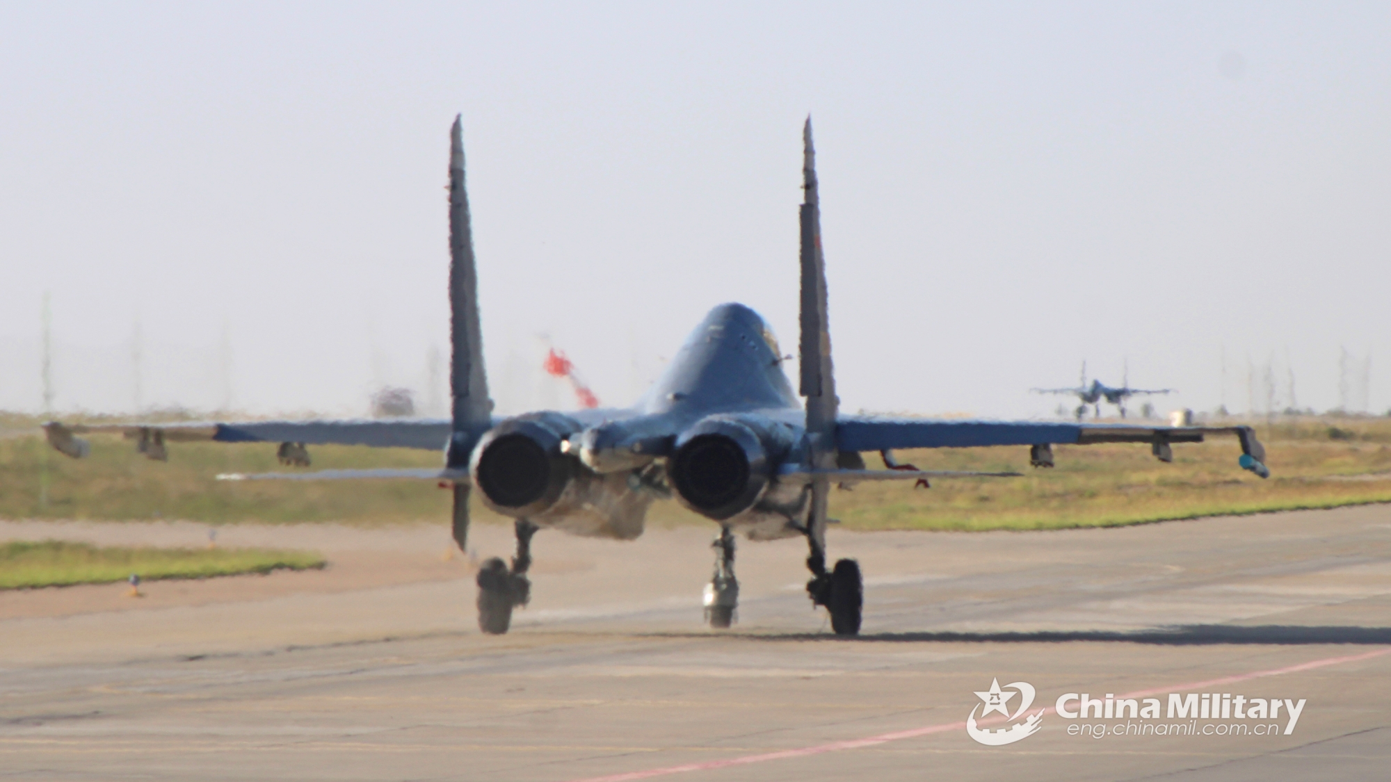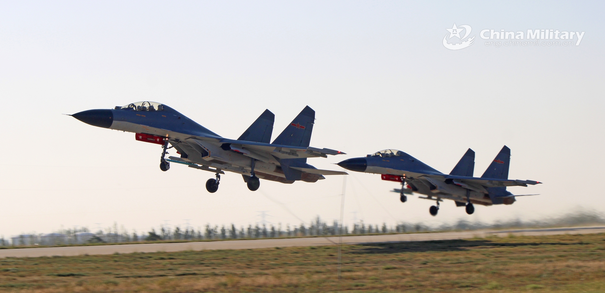 Two J-11 fighter jets attached to an aviation brigade with the air force under the PLA Western Theater Command take off in formation during a flight training exercise on September 21, 2023. (eng.chinamil.com.cn/Photo by Wang Shiying)