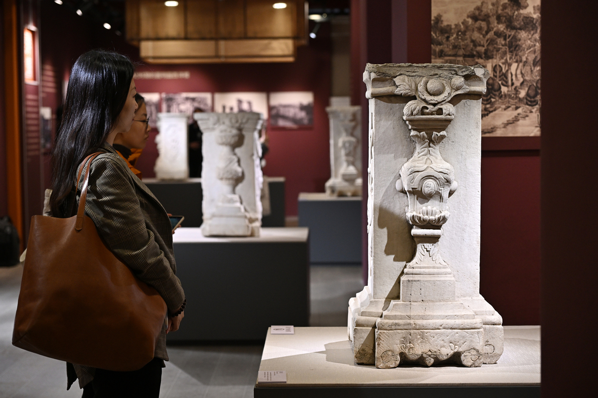 Marble columns from Yuanmingyuan, or the Old Summer Palace, is on display at Zhengjue Temple of Yuanmingyuan Ruins Park in Beijing on Friday. An exhibition displaying all seven marble columns repatriated from Norway opened to the public on Friday. [Photo/Xinhua]