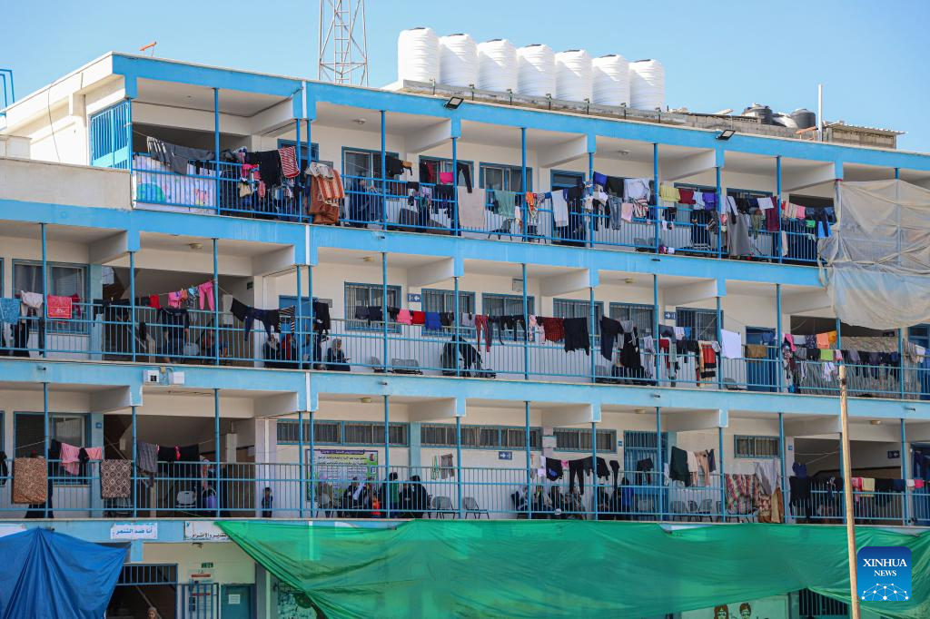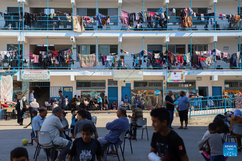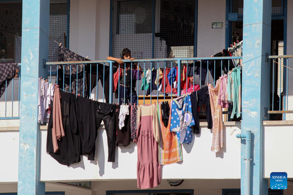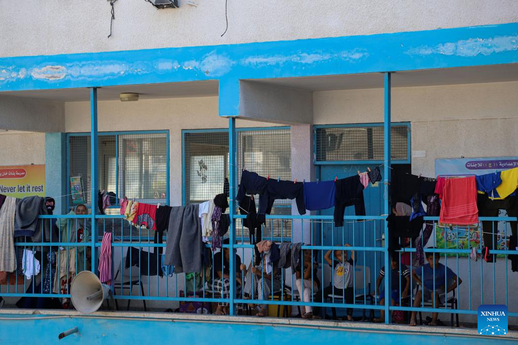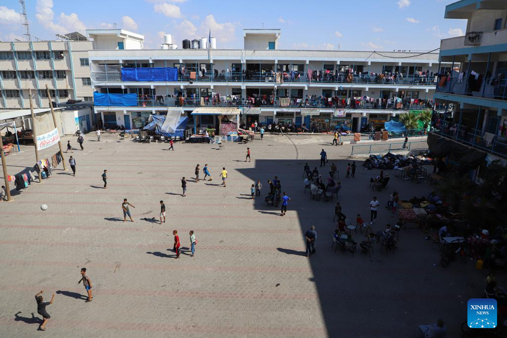 Displaced Palestinians temporarily live in a school in the southern Gaza Strip city of Khan Younis, Oct. 15, 2023. The United Nations estimated that more than half a million people in the Gaza Strip were displaced from their residences, noting that the UN Agency for Palestine Refugees received about 64 percent of those displaced in 102 emergency shelters, with difficulties providing essential services. (Photo by Rizek Abdeljawad/Xinhua)