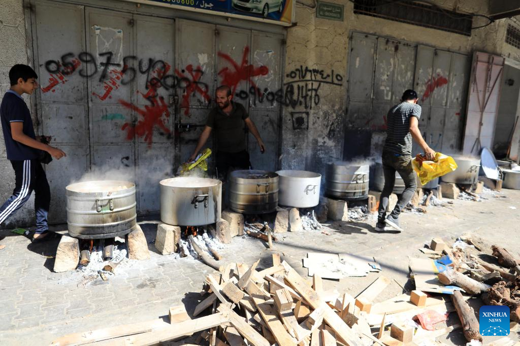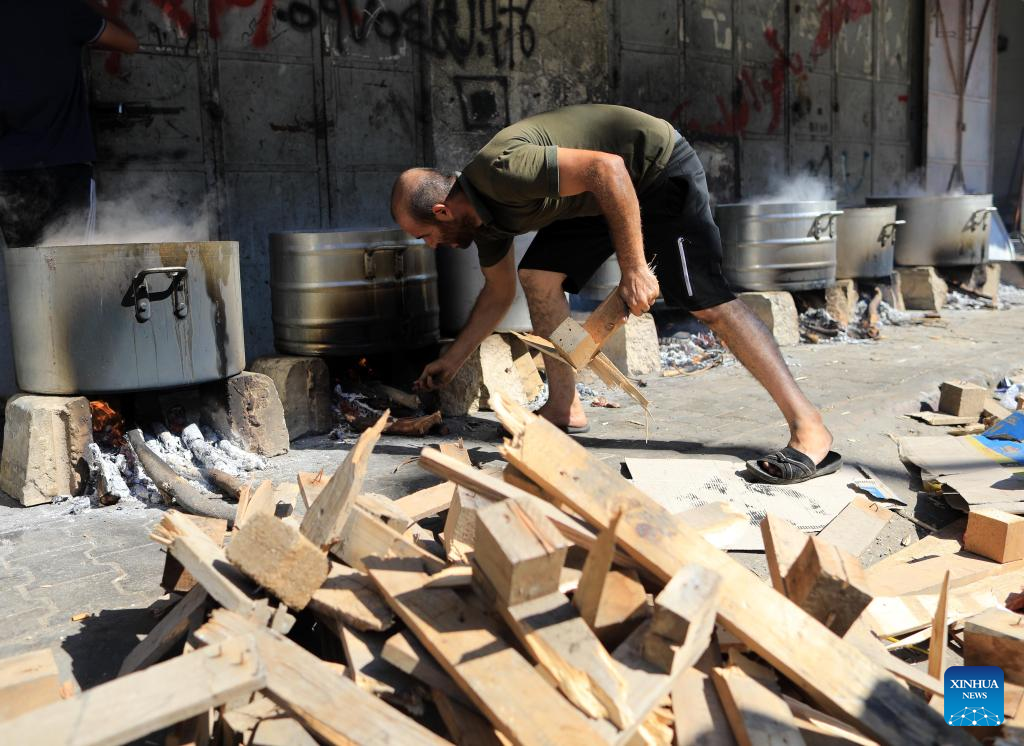A man cooks food on firewood after a gas cutoff in the southern Gaza Strip city of Khan Younis, Oct. 15, 2023. The United Nations estimated that more than half a million people in the Gaza Strip were displaced from their residences, noting that the UN Agency for Palestine Refugees received about 64 percent of those displaced in 102 emergency shelters, with difficulties providing essential services. (Photo by Yasser Qudih/Xinhua)
