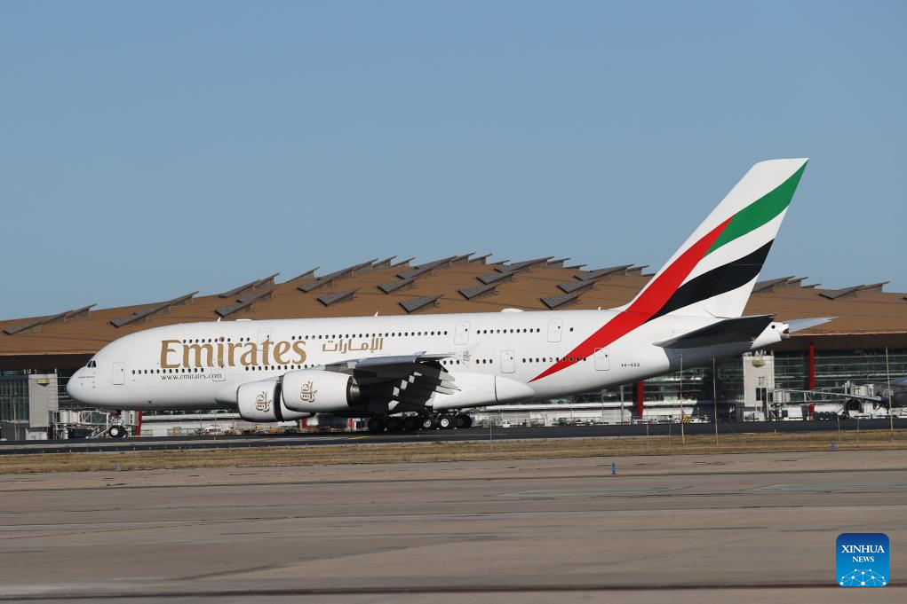 An airplane carrying Kenyan President William Ruto lands in Beijing, capital of China, Oct. 15, 2023. Ruto will attend the third Belt and Road Forum for International Cooperation. (Xinhua/Jin Liwang)