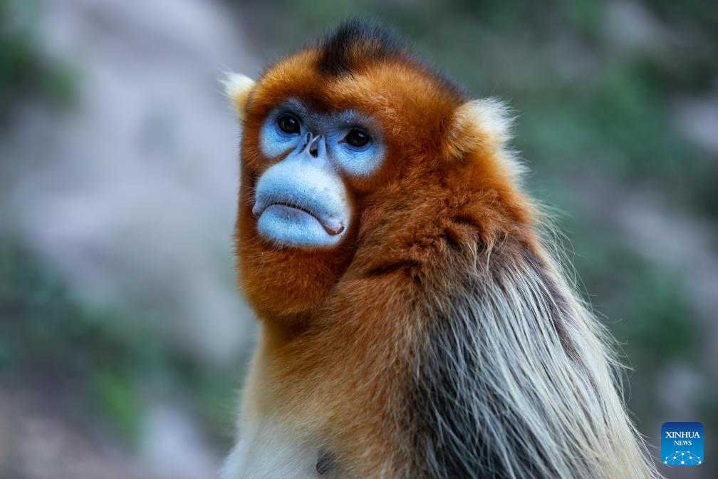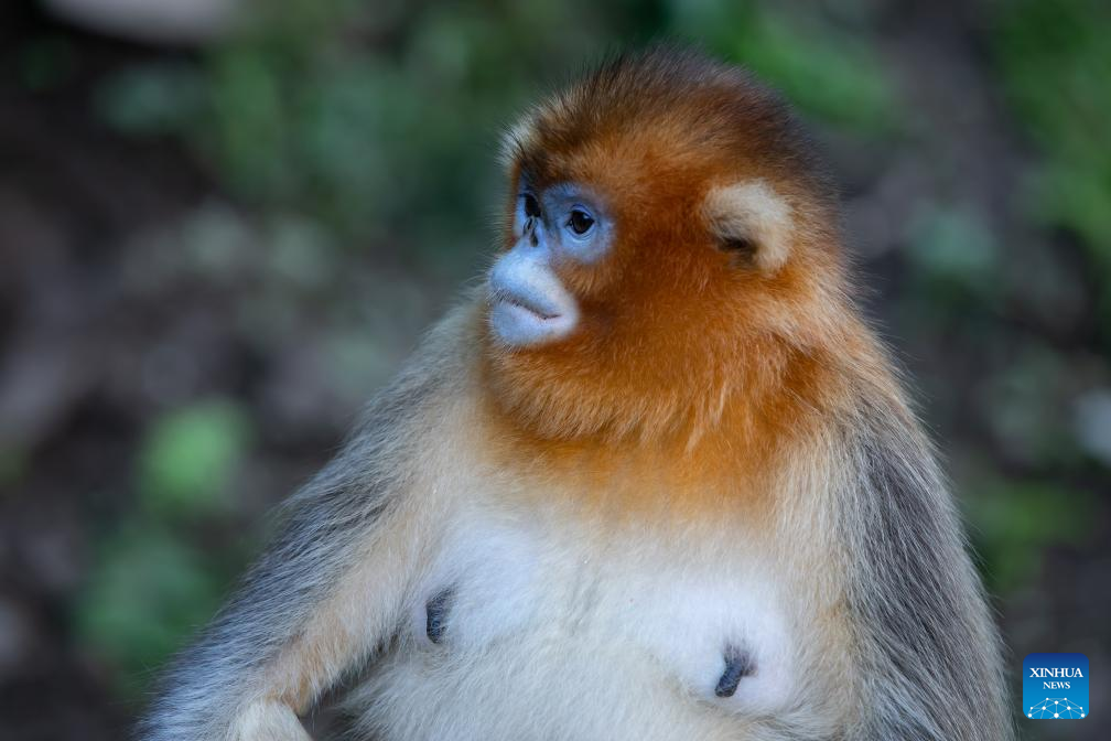 This photo taken on Oct. 14, 2023 shows a Sichuan golden snub-nosed monkey at the Yuhe area of the Giant Panda National Park in northwest China's Gansu Province.