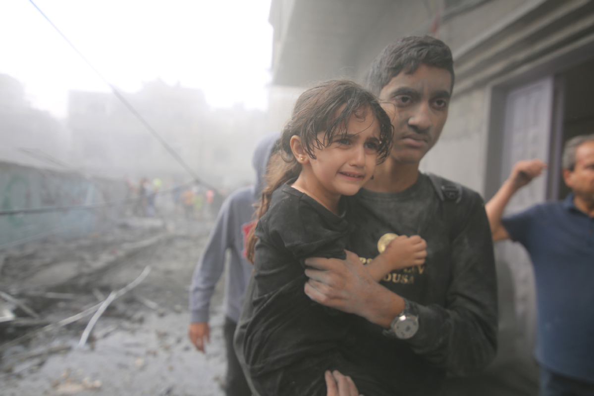 A man holds a girl in his arms and evacuates from a building destroyed in Israeli airstrikes in the southern Gaza Strip city of Rafah, on Oct 12, 2023. [Photo/Xinhua]
