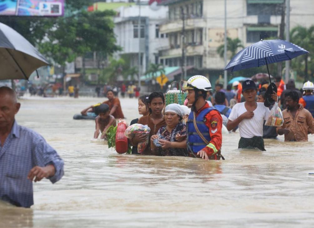 People wade through a flooded area in Bago Region of southern Myanmar, Oct 10, 2023. [Photo/Xinhua]