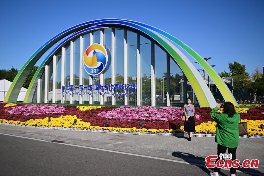 A staff member poses for a photo in front of a flower decoration at the Media Center for the third Belt and Road Forum for International Cooperation in Beijing, Oct. 15, 2023. (Photo: China News Service/Tian Yuhao)