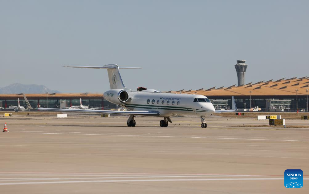 An airplane carrying Nigerian Vice President Kashim Shettima lands in Beijing, capital of China, Oct. 16, 2023. Kashim Shettima will attend the third Belt and Road Forum for International Cooperation. (Xinhua/Jin Liwang)
