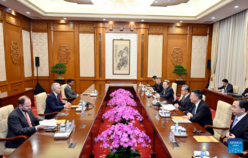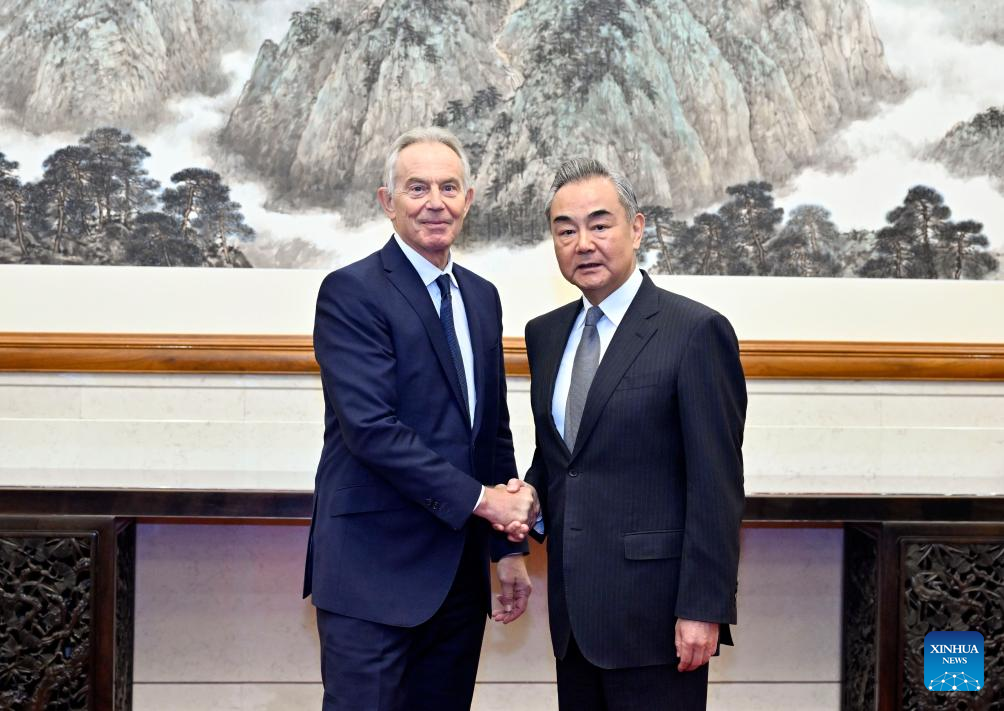 Wang Yi, a member of the Political Bureau of the Communist Party of China (CPC) Central Committee and director of the Office of the Foreign Affairs Commission of the CPC Central Committee, meets with former British Prime Minister and former Labour Party leader Tony Blair in Beijing, capital of China, Oct. 16, 2023. (Xinhua/Yin Bogu)