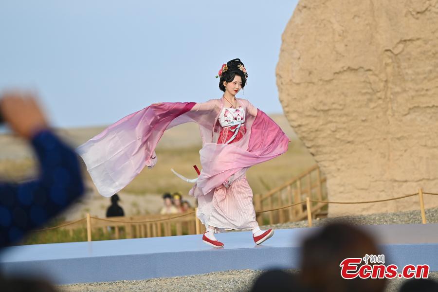 A model in traditional Chinese costume walks the runway during the 2023 Dunhuang International Fashion Week at Yumenguan Pass scenic spot in Dunhuang, northwest China's Gansu Province, Oct. 15, 2023. (Photo: China News Service/Li Yalong)