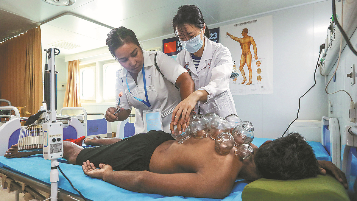 A TCM doctor on board the Chinese naval hospital ship Peace Ark instructs a Kiribati nurse on a cupping therapy procedure. Li Yu / Xinhua