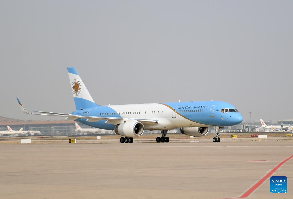 An airplane carrying Argentine President Alberto Fernandez lands in Beijing, capital of China, Oct. 17, 2023. Alberto Fernandez will attend the third Belt and Road Forum for International Cooperation. (Xinhua/Ren Chao)