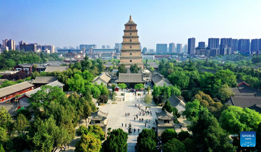 This aerial photo taken on April 19, 2023 shows a view of the Giant Wild Goose Pagoda in Xi'an, northwest China's Shaanxi Province. About 2,000 years ago, in the Western Han Dynasty (202 B.C.- A.D. 25), a Chinese envoy named Zhang Qian began his expedition to the Western Regions and opened a trade route that later became the Silk Road.