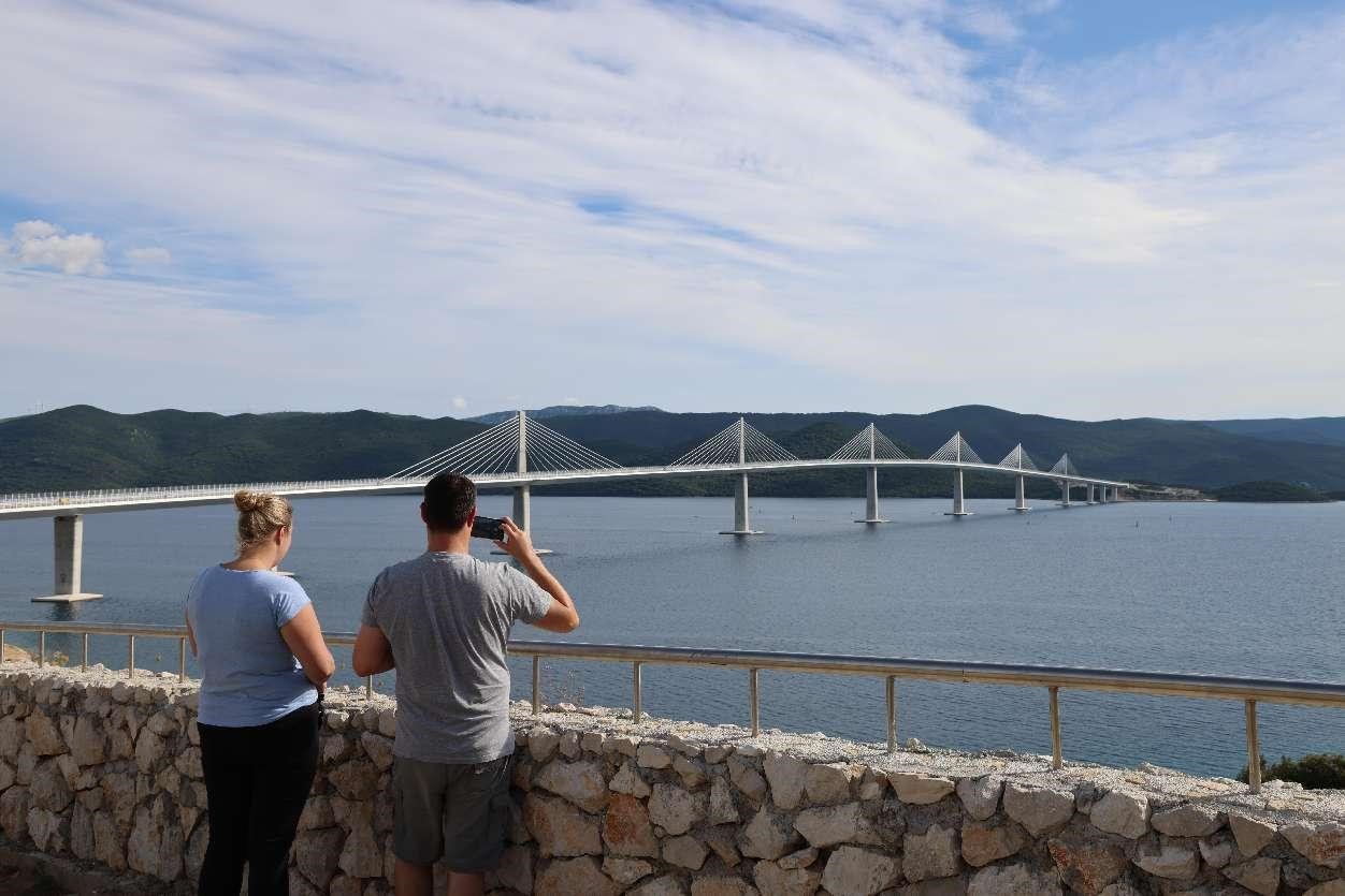 Tourists take photos of the China-constructed Peljesac Bridge in southern Croatia. (People's Daily/Liu Zhonghua)