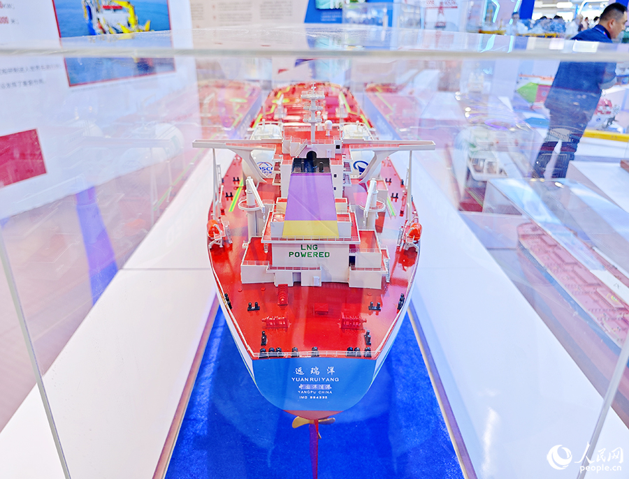 Photo shows a model of the Yuan Rui Yang, the world's first LNG dual-fuel very large crude carrier (VLCC) with a capacity of 300,000 tonnes, at an exhibition of China's major achievements in the development of marine equipment over the past decade. This was an important part of the World Marine Equipment Conference 2023 in Fuzhou, southeast China's Fujian Province. (People's Daily Online/Huang Dongyi)