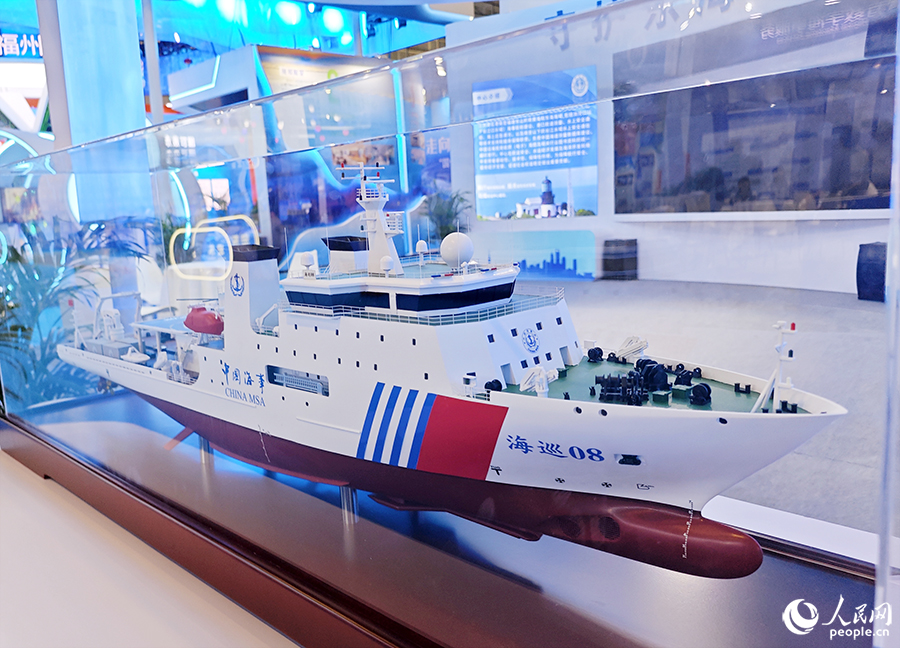Photo shows a model of the Haixun 08, China's first, largest and most advanced self-designed surveying ship, being exhibited at the China Marine Equipment Expo 2023 in Fuzhou, southeast China's Fujian Province. (People's Daily Online/Huang Dongyi)