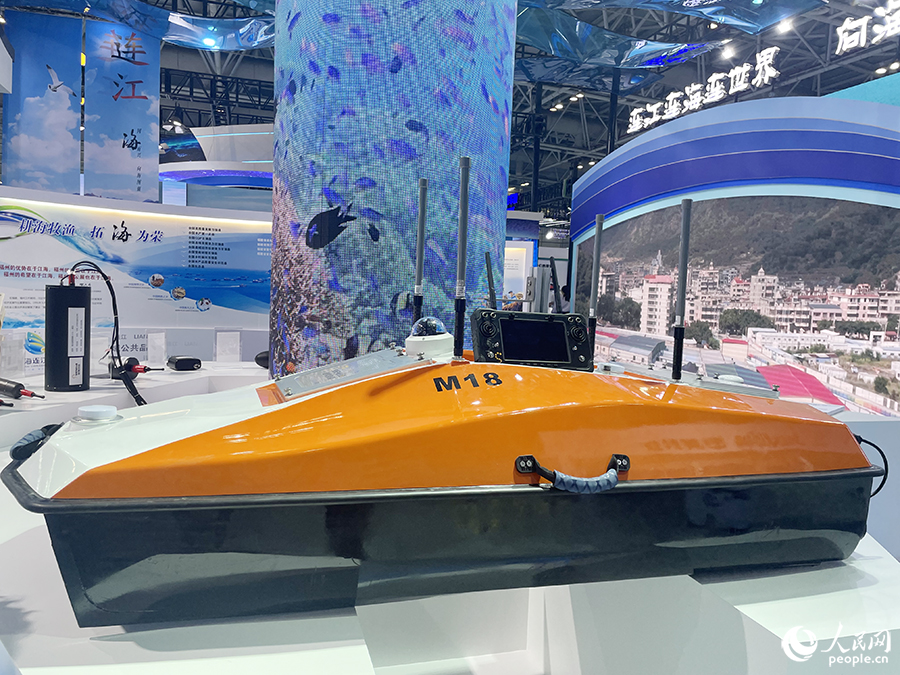 Photo shows an unmanned yacht on exhibit at the China Marine Equipment Expo 2023 in Fuzhou, southeast China's Fujian Province. (People's Daily Online/Lin Ying)