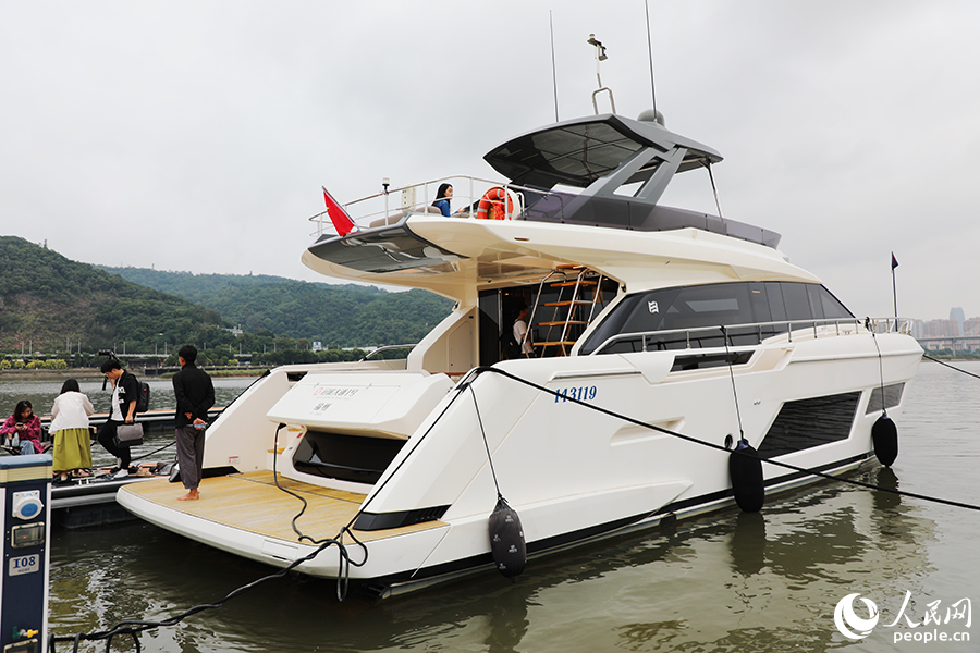Photo shows a Ferretti yacht 670 on display at the China Marine Equipment Expo 2023 in Fuzhou, southeast China's Fujian Province. (People's Daily Online/Huang Dongyi)
