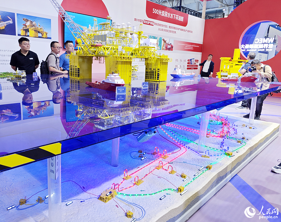 Photo shows a model of China's self-developed deepwater semi-submersible oil production and storage platform, Deep Sea No.1, at an exhibition of China's major achievements in the development of marine equipment over the past decade. The exhibition was an important part of the World Marine Equipment Conference 2023 in Fuzhou, southeast China's Fujian Province. (People's Daily Online/Huang Dongyi)