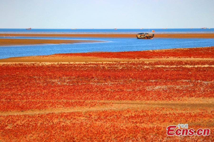 Clusters of seepweed dye the Yellow River Estuary Wetland with bright red in Autumn, forming a "red carpet" landscape in Dongying, east China's Shandong Province. (Photo provided to China News Service)