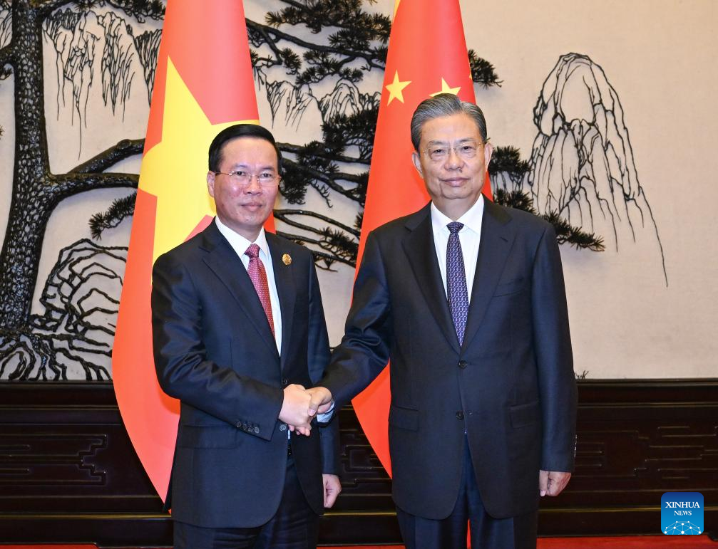 Zhao Leji, chairman of the National People's Congress (NPC) Standing Committee, meets with Vietnamese President Vo Van Thuong in Beijing, capital of China, Oct. 17, 2023. (Xinhua/Rao Aimin)