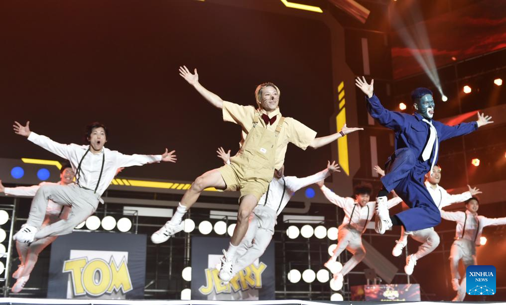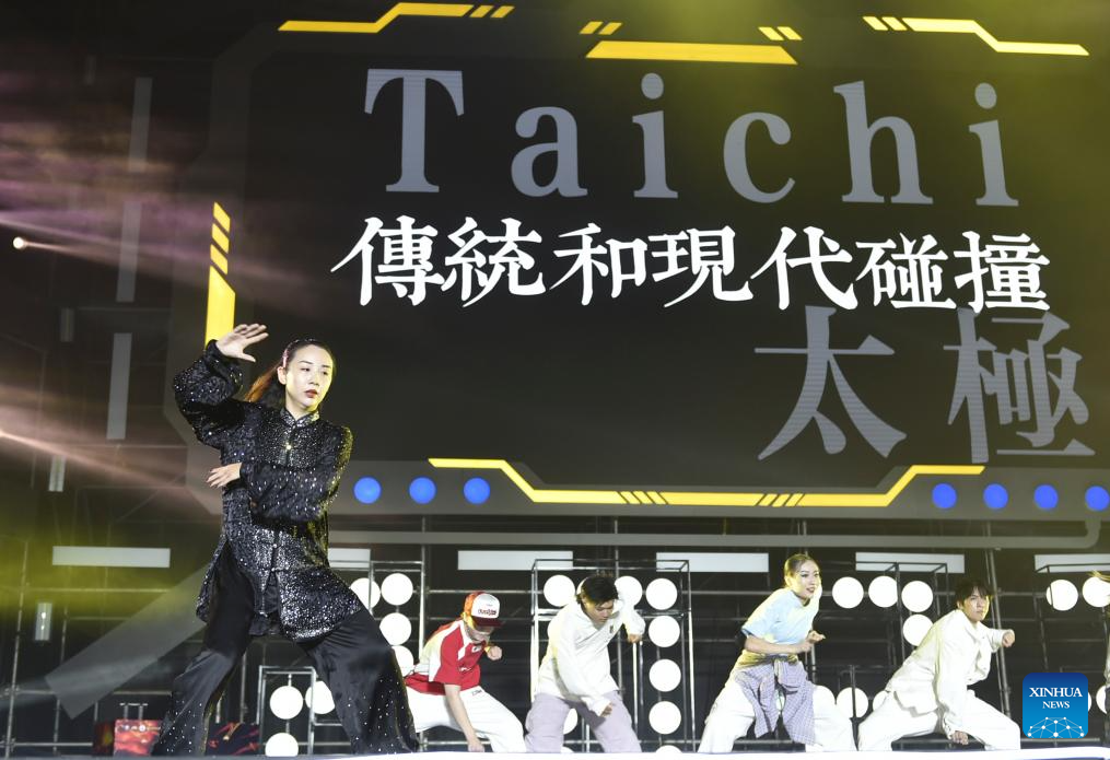 Actors perform Taichi during the opening show of the final of a street dance competition in Zhengzhou, central China's Henan Province, Oct. 16, 2023. The final of the ninth World Dance Games (WDG) China international street dance competition was held here Monday evening. Nearly 3,000 dancers from home and broad were engaged in the ninth WDG competition. (Xinhua/Lu Peng)