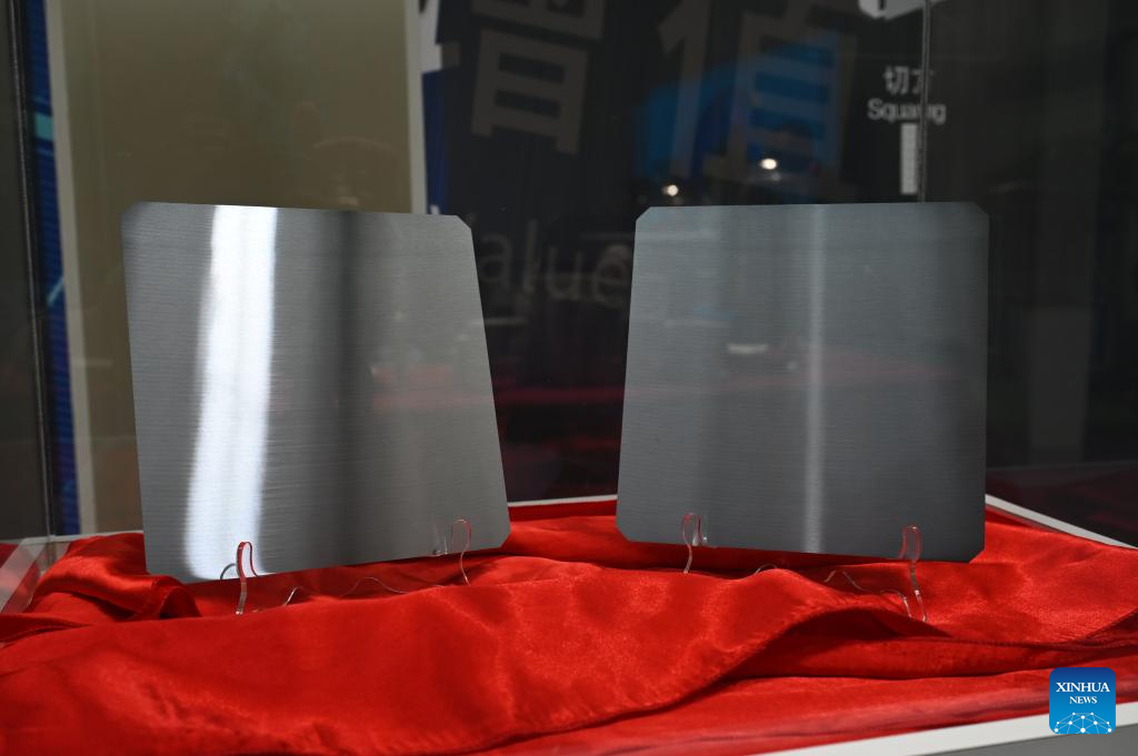 This photo taken on Oct. 17, 2023 shows products of LONGi Green Energy Technology Co., Ltd., a leading enterprise in the solar photo-voltaic (PV) industry in China, at its new plant launched in Selangor state of Malaysia. (Photo by Cheng Yiheng/Xinhua)