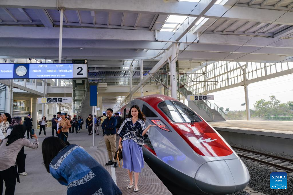 Passengers pose for photos with a high-speed electrical multiple unit (EMU) train at the platform of Tegalluar Station on the Jakarta-Bandung High-Speed Railway in Bandung, Indonesia, Oct. 17, 2023. The Jakarta-Bandung High-Speed Railway (HSR) jointly built by China and Indonesia was officially put into commercial operation on Tuesday.