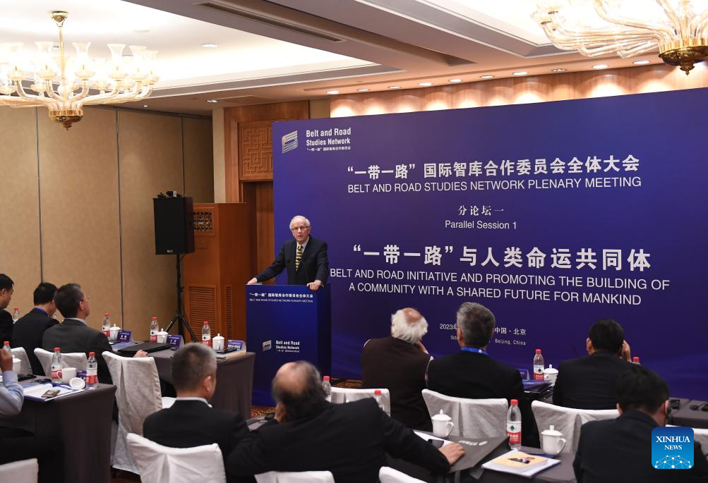 This photo taken on Oct. 17, 2023 shows the parallel session on Belt and Road Initiative and Promoting the Building of a Community with a Shared Future for Mankind during a plenary meeting of the Belt and Road Studies Network (BRSN) in Beijing, capital of China. (Xinhua/Zhang Chenlin)