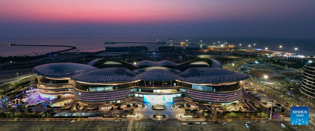 This aerial photo taken on April 4, 2023 shows the view of Haikou International Duty Free City (front) and Xinhai comprehensive passenger transport hub (rear) in Haikou, south China's Hainan Province. (Xinhua/Yang Guanyu)