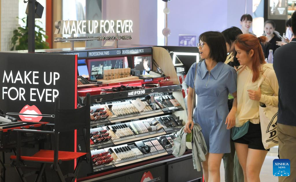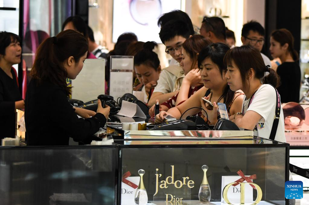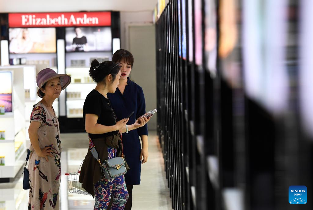 This photo taken on July 12, 2023 shows tourists selecting products at a duty-free shop in Haikou, south China's Hainan Province. (Xinhua/Yang Guanyu)