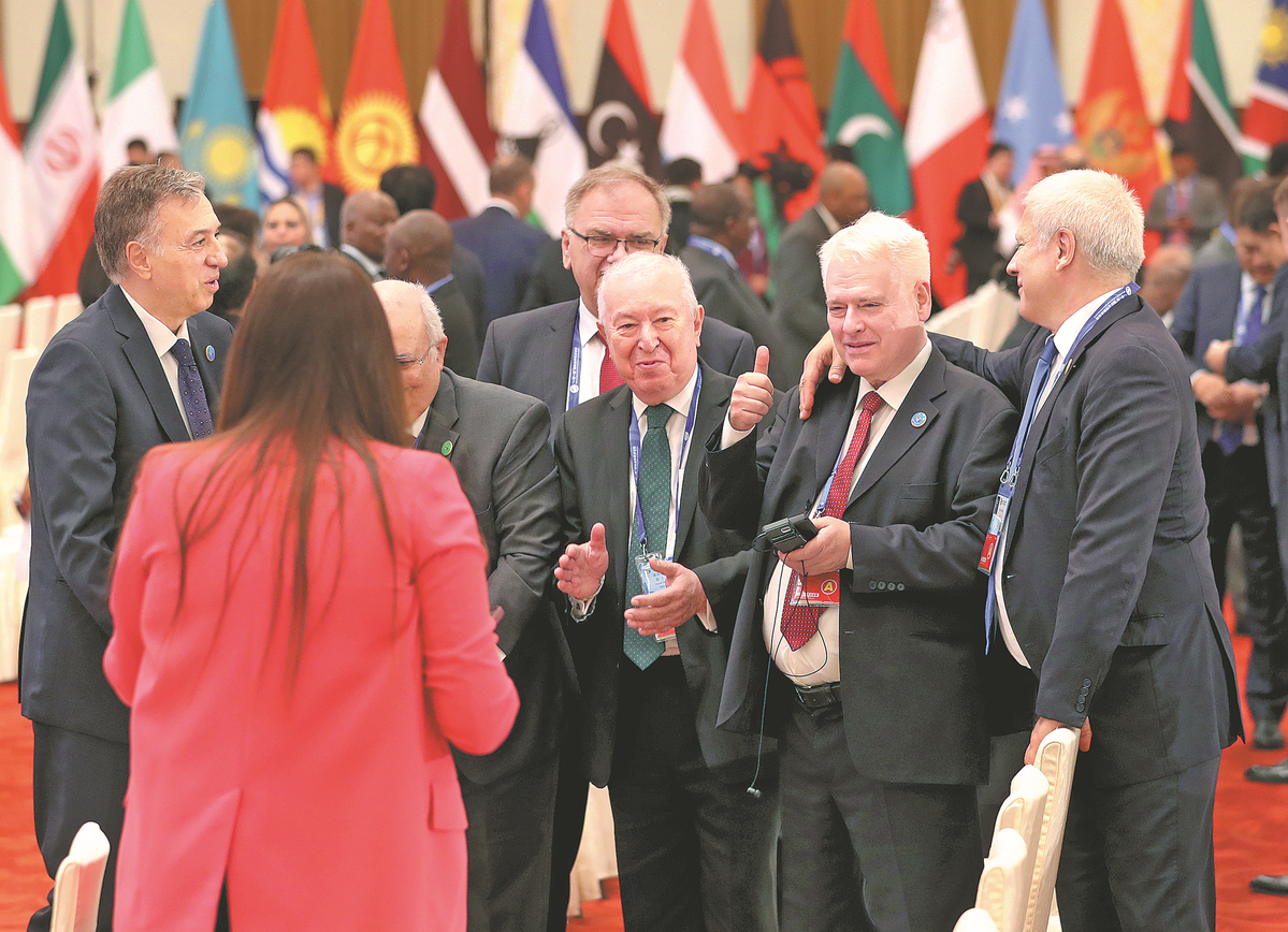 Guests talk on the sidelines of the forum at the Great Hall of the People on Wednesday. ZOU HONG/CHINA DAILY
