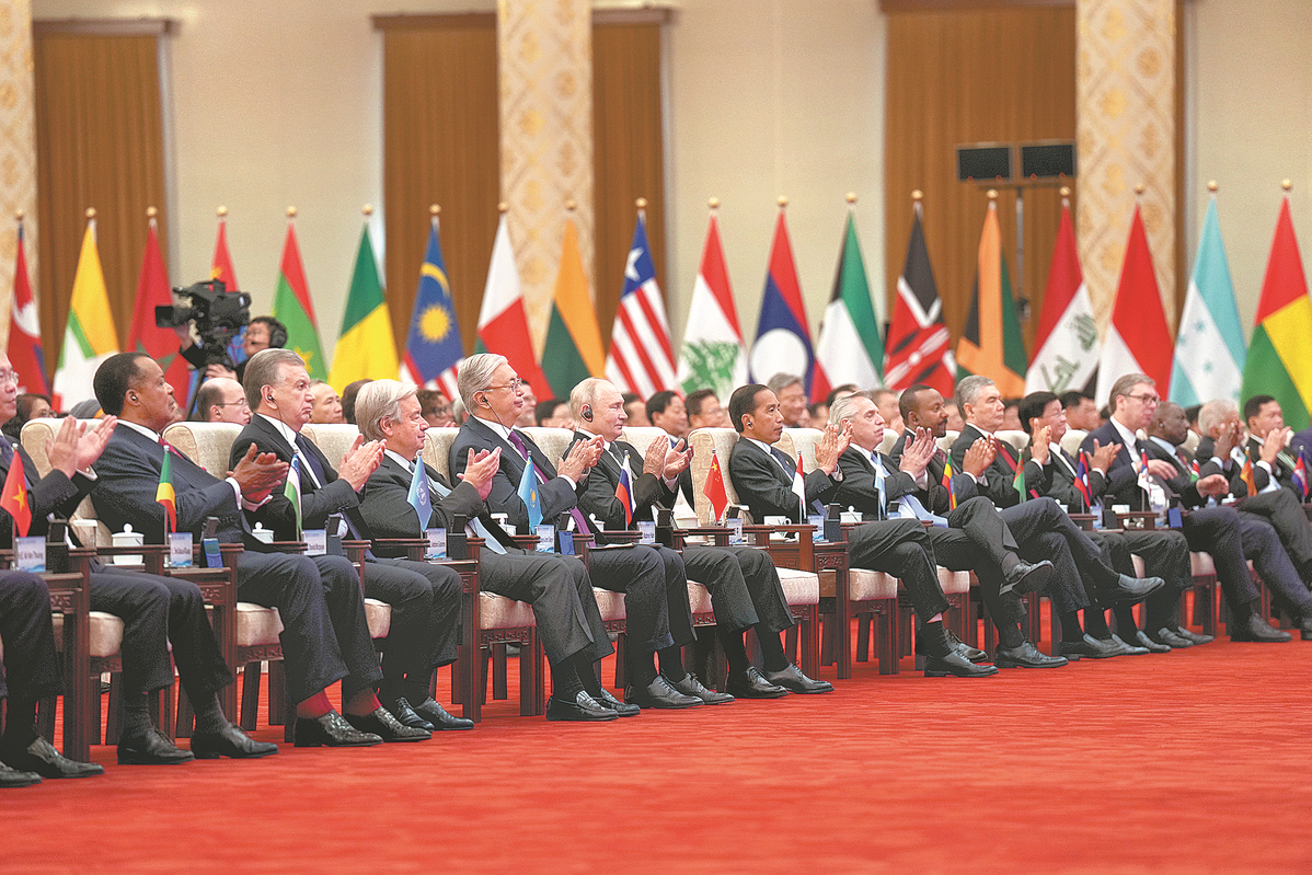 Foreign leaders attending the third Belt and Road Forum for International Cooperation applaud at the forum's opening ceremony in the Great Hall of the People on Wednesday. ZHANG YAO/FOR CHINA DAILY