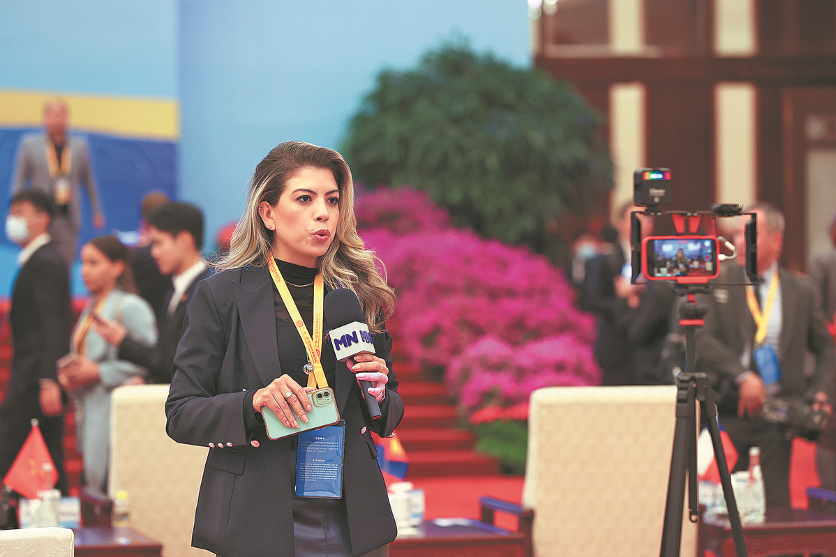 A foreign journalist conducts a live broadcast at the opening ceremony of the third Belt and Road Forum for International Cooperation on Wednesday in Beijing. CHINA DAILY