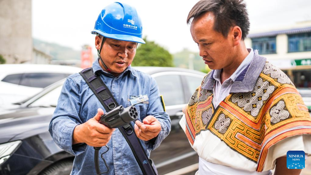 A staff member of a local public utility company instructs a resident to use a charging pile at Huiyi Village, Zhongshan District of Liupanshui City, southwest China's Guizhou Province, Sept. 22, 2023. In recent years, the Guizhou Power Grid Co., Ltd of China Southern Power Grid has been working diligently to extend the charging network for new energy vehicles to the rural areas. Charging piles are now available in every township in Guizhou thanks to well orchestrated efforts to fully meet the public's demand for eco-friendly transportation in the past few years. (Xinhua/Tao Liang)