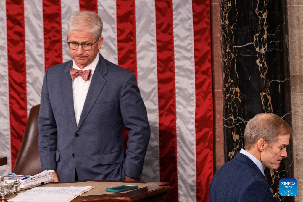 U.S. Right-wing Republican Jim Jordan (R), chairman of the House Judiciary Committee, is seen with Speaker Pro Tempore Patrick McHenry in the House chamber in Washington, D.C., the United States, on Oct. 18, 2023. (Photo by Aaron Schwartz/Xinhua)