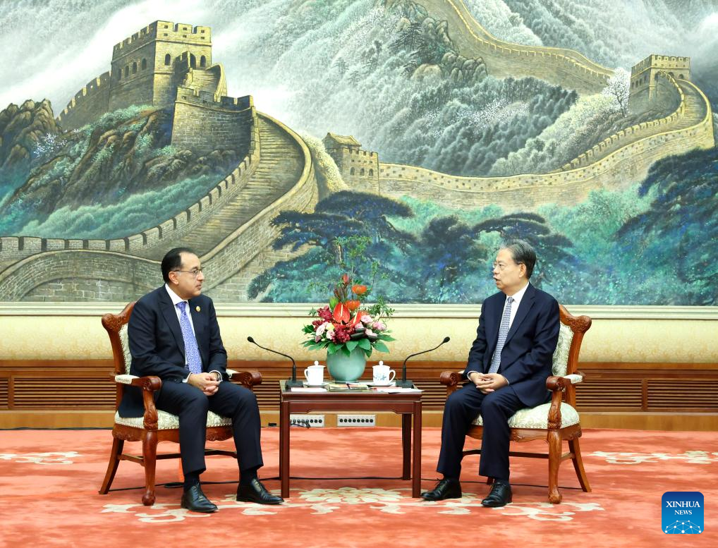 Zhao Leji, chairman of the National People's Congress (NPC) Standing Committee, meets with Prime Minister of Egypt Mostafa Madbouly in Beijing, capital of China, Oct.18, 2023. (Xinhua/Pang Xinglei)
