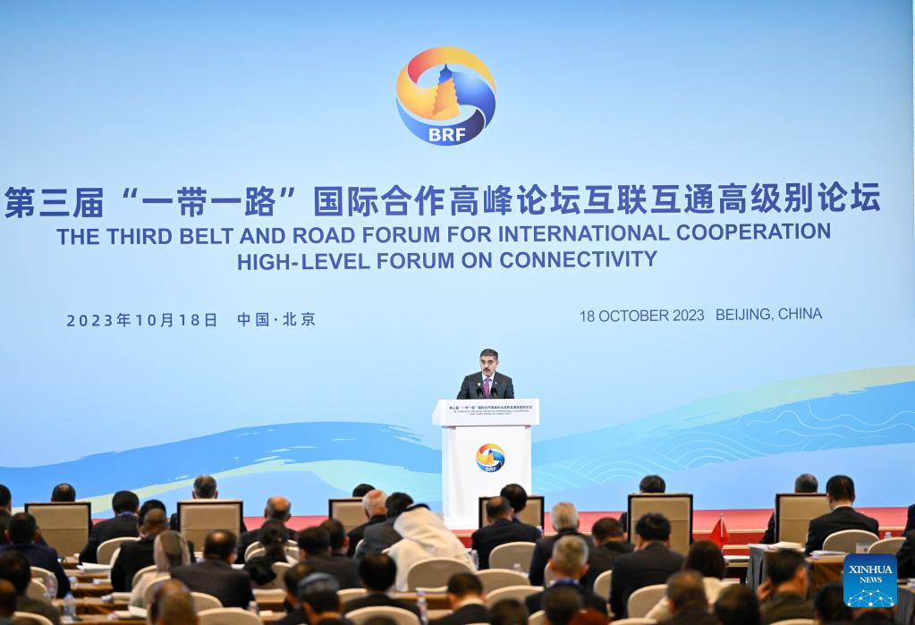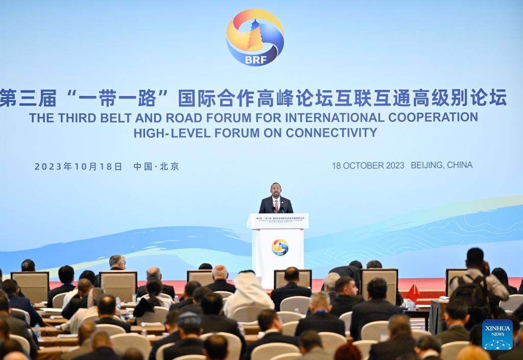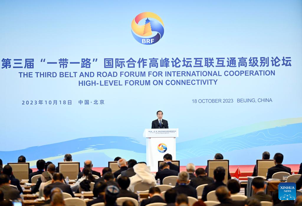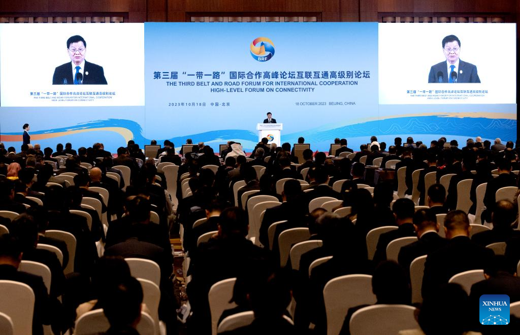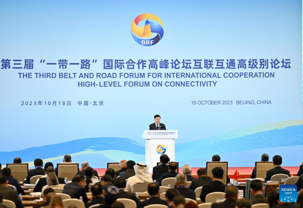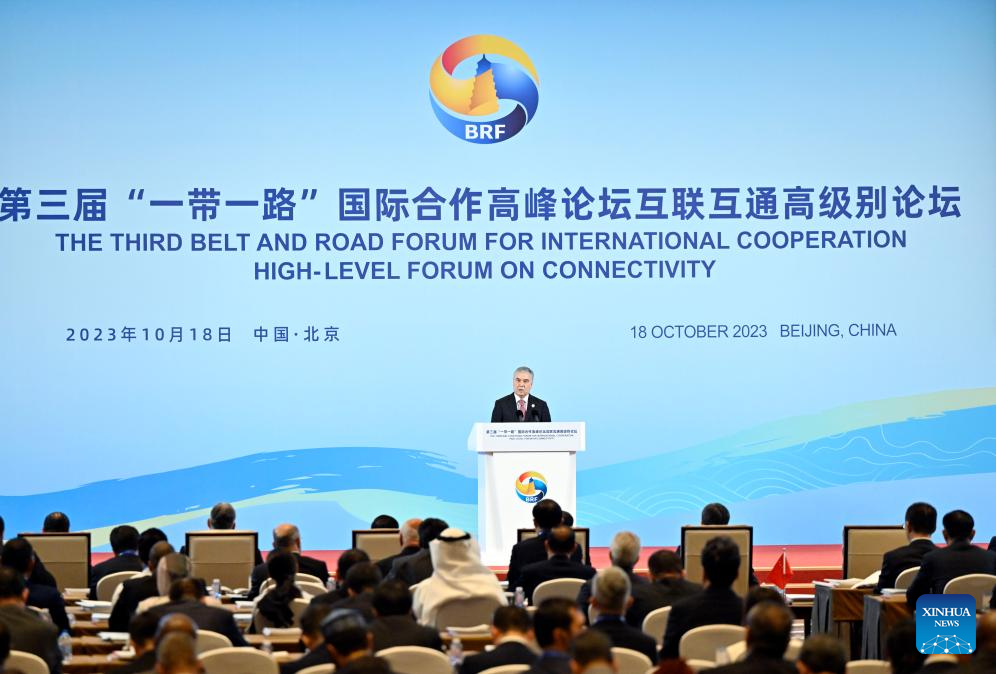Guests attend the High-Level Forum on Connectivity of the third Belt and Road Forum for International Cooperation in Beijing, capital of China, on Oct. 18, 2023. High-level forums on connectivity, green development and digital economy of the third Belt and Road Forum for International Cooperation were held in Beijing on Wednesday. (Xinhua/Jin Liwang)